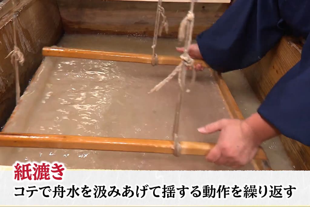 手打ちと叩解の後、舟水づくりを行い、紙漉きという最も重要な工程に移ります。