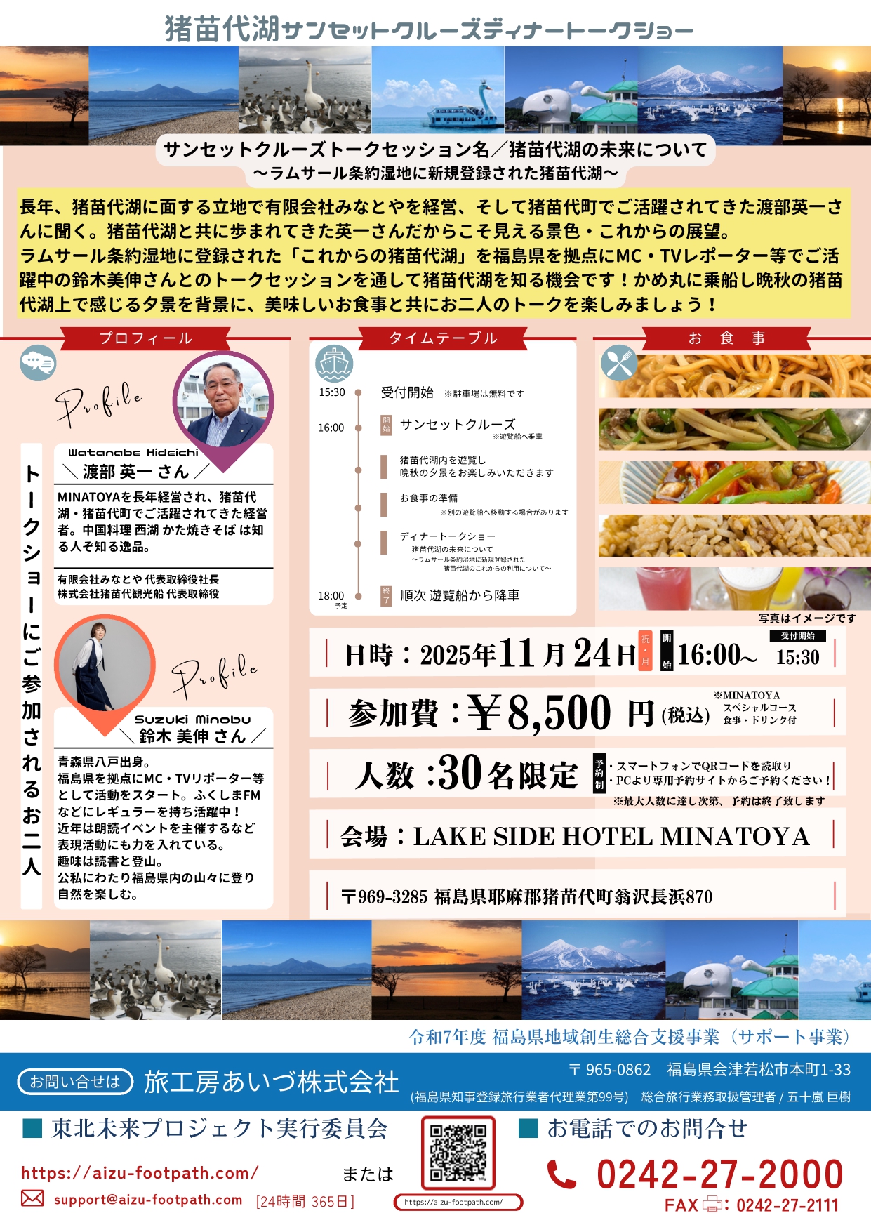 | タイムテーブル | ・15:30:受付開始 ・16:00:サンセットクルーズ ・猪苗代湖内を遊覧 ・2025秋猪苗代湖の夕景を楽しむサンセットクルーズ ・渡部英一氏と鈴木美伸さんのトークショー ・猪苗代湖遊覧+かめ丸での中華ディナー ・18:00(予定):降車 |